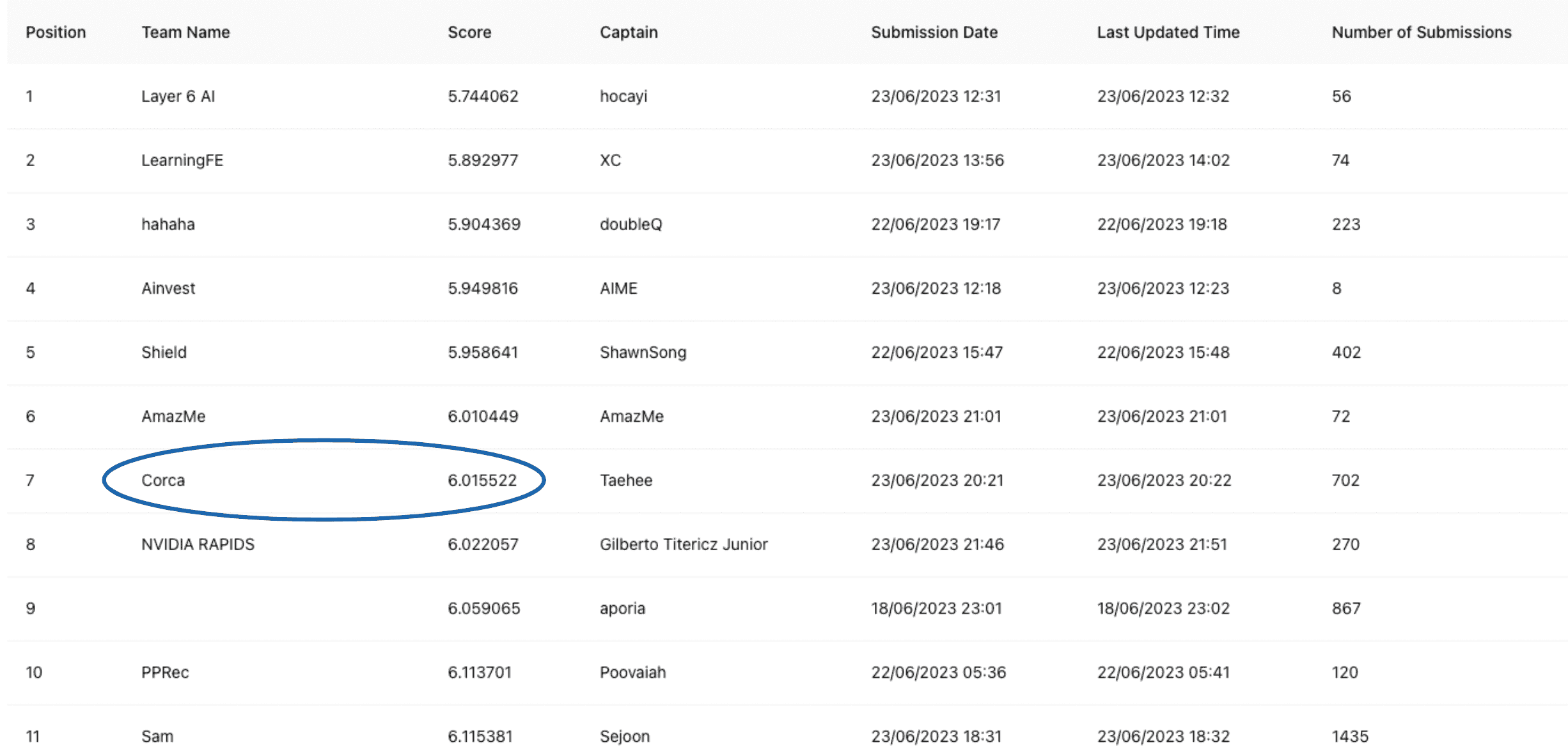 결과적으로 대회는 7등으로 마무리했다. 한국에서는 삼성 포함 다른 기업을 제치고 1등이다. 엔비디아는 8등했다 ㅎ. 후일담으로 엔비디아는 다른 대회(KDD) 가서 1등 했다지만 ㅎㅎ... 어쨌든 당당하게 외칠 수 있다. 코르카 밑에 엔비디아!